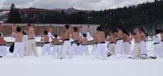 やってみると意外に楽しく、皆本気になって雪玉を投げていました。私も巨大な雪の塊を円盤投げで相手に投げようとしたら、目の前にいた味方のアフガニスタン人の後頭部に思い切り当たってしまい、敵陣には微塵も届かないというアクシデントがありました。毎度毎度余計な事をしでかす私ですが、その後男性は上半身裸になり全員が裸足になって、皆が異様なテンションになるなか基本稽古を行いました。