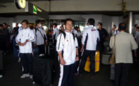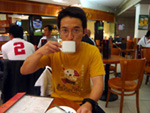 まだまだ外は暗く、上手く暇を潰せないまま空港内をウロウロしていると、オープンしたてのカフェに岡崎師範を見つけました。…が、勝手に席に着いていいものか?どうやって注文したらいいのか?とわからない事だらけだったので、皆で師範の前をウロウロしてみました(笑)
