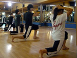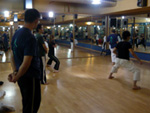 ホテルに戻った私達は、再びジムに集合し朝の稽古の続きをしました。個別に型の稽古をしている皆を、私はそこにあったバランスボールに乗りながら見ていました。