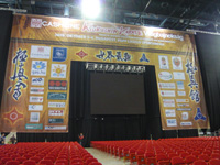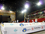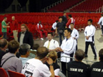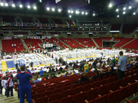 型の予選は明日に行われるので、特に予定の無い型チームは一日中組手チームの応援に3コートある試合場の間を行ったり来たりしていました。世界大会ともなると交通機関の影響などもあるのか欠場する選手が目立ち、選手呼び出しの「ラストコール」が何度も試合場に響いていました。