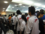 軽く汗を流した後朝食を摂りにホテルへ戻り、開会式に出席するべく再び体育館へ戻りました。朝の厳戒態勢に少し怖気づいた私は、観客と自分とを明確に区別してもらうため持参した審判の服装で体育館に行きました。けれど受付で「ユー、ジャッジ?(あなたは審判か?)」と聞かれ、スタッフとは答えたものの『もしかして逆に怪しい!?』と急に自信が無くなり、なんだか嘘を付いているようで一日中落ち着かない気持ちで過ごしました。挙句の果ては写真を撮るのに客席とアリーナの間をうろうろしているところをSPに止められ、手首に巻いているものを見せろというようなジェスチャーをされてしまい、正直ビビりました。慌ててかなり大振りな動作で通行証を見せましたが、追い出されたらどうしようと気が気じゃなかったです。