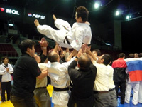 その日は組手の本選の他に各団体の代表者の演武があり、岡崎師範と石島師範の演武やハンガリー支部長の演武に加え、なぜかサンバダンサーのダンス披露もあって、全ての日程が終わったのは午後10時を過ぎた頃でした。表彰式の後にメインコートの上で記念撮影をして、入賞した型チームの面々の胴上げもしました。私の友達が書いてくれた横断幕を持った写真も撮りました。終いにはスタッフの方達に追い出されるように会場を後にし、疲れた身体に鞭打って重たいトロフィーをホテル4階の自分達の部屋まで持ち帰りました。