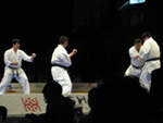 暗がりに浮かび上がる照明に照らされたメインコートに、次々に選手が上がっては演武を終えて降りて行きました。6番目に井上さんが上がりました。隣で村椿先生が「雄太頑張れ!」と言いました。緊張の糸を張りつめ、勢いのある型を打って井上さんは舞台を降りました。日本男子のトップバッターを見事に務め上げた井上さんの頑張りに、先生方全員で拍手を送っていました。