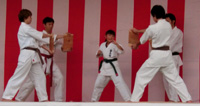 今回は玉川・平田・須賀川・白河・郡山道場から40名以上が参加してくれました。 いつものように全体で、三戦立ちからの正拳中段突きを行うと、元気いっぱいの気合に惹かれるようにたくさんのお客さん達が集まってきてくれました。続いて白帯による基本の蹴り方の披露になると、拙いながらも精一杯気合を出して、前蹴りを披露していました。 なかでも、「屋台に行きたい」とリハーサル中大泣きして出演が危ぶまれていた遠藤尚輝君は、幼稚園児ながらしっかり持ち直して堂々と演武していたのが微笑ましかったです。 次にオレンジ・小豆帯による移動稽古、水色・青帯によるハンドミット、黄緑帯から茶帯による撃砕小と続き、遠藤綾乃初段と松崎亮哉1級による大城の棍とその組棒を披露しました。 演武も終わりに近づき、初級から上級までの6組による組手を行い、最後に増子分支部長の五十四歩の型と瓦割り、矢部洋士指導員による瓦割り、古川達也初段によるバット折りを次々と成功させて演武を締めくくりました。 演武終了後、小さい子どもから大人まで一丸となって頑張る姿に、各方面からたくさんのお褒めの言葉をいただきました。 ●南東北大会で玉川拳士2名が入賞! そのうち小学生中学年男子型の部に出場した我妻来飛君は、持ち前の安定した丁寧な型で出場者数45名のトーナメントを勝ち上がり、決勝では平安その2の型で見事準優勝を果たし自身初のトロフィーを手にしました。 また、小学生低学年女子型の部に出場した増子遥菜さんは、予選から丁寧な型で審判全員の旗をもぎ取り、決勝でも鋭い突きと落ち着いた型で第3位に入賞しました。また、組手では得意の突きの連打に加えて中段回し蹴りも冴えわたり、第3位入賞を決め玉川分支部では唯一の2部門入賞を果たしました。 |