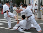 | ●道の駅空の駅まつりで演武を披露! 平成26年11月8日(土)に福島空港で開催された「道の駅・空の駅まつり」にて、毎年恒例の演武を玉川・須賀川道場合同で披露し、約25名が参加しました。 お笑い芸人の山本高広さんが登場する直前の時間帯だったので、多くのお客さんが集まる中で演武を披露することが出来ました。 いつものように白帯は基本稽古、青帯は移動稽古と太極その1、黄色・藤色帯はハンドミット、黄緑〜茶帯は撃砕小とレベルに合わせた内容で行いました。その後、子供達による板割りを行い、小さい子の中では割れなかった子もいましたが、お客さんから沢山の拍手をいただきました。 今回は、矢吹流夏君が初めて四方割りに挑戦し、4枚全てを綺麗に成功させました。 その他にも棒術の型やサイと棒の打ち合い等武器術も披露し、バット折りと瓦割りも行って内容盛り沢山の20分間となりました。 ●松明あかしで演武を披露! 平成26年11月8日同日、「道の駅・空の駅まつり」演武に引き続き、須賀川市の三大火祭り「松明あかし」のオープニングイベントでも演武を行いました。 こちらも毎年恒例になりつつあり、玉川・須賀川道場合同で約25名が参加しました。 内容的には道の駅・空の駅まつり演武とほぼ同様でしたが、こちらは地元の須賀川道場生を中心として行いました。 特に板割りでは内藤武蔵、内藤大地兄弟が飛び後ろ回し蹴りで割り、大いに会場を沸かせていました。 また、こちらでも深谷舞さんが初めて四方割りに挑戦し、ノーミスで見事4枚を割る事ができました。 最後に古川達也指導員によるバット2本折りと遠藤総芳初段と馬場哲明指導員による瓦割りで締めくくりました。 演武終了後、夜になるのを待って行われた松明あかしの子松明行列に、道着を着て参加しました。 例年雨に悩まされる松明あかしですが、この日はめずらしく天気に恵まれたので、心置きなく幻想的な雰囲気を楽しむことが出来ました。 ●増子分支部長が古殿中学校で講演! 「地方でも夢は叶えられる」と題した講演では、空手や仕事などを通して人との関わりを大事にしていること、空手で様々な仲間に出会えた事、そして沢山の人達に支えられて夢をかなえるまでの軌跡を、今回初めて取り入れたパワーポイントを駆使して講演しました。テレビ出演した際の映像なども交えながら60分間の講演を終え、その後、長女の夏穂さんと共に演武を披露しました。 今回の講演会は、聴衆が古殿中学校の全生徒、全保護者、教職員約300名という過去最高の人数で、パソコンの不具合で一時パワーポイントが動かなかったことなど色々とハプニングもありましたが、かえって肝が据わった増子分支部長の喋りがウケて、講演会終了後に面白かったという感想を沢山いただくことが出来ました。。 貴重な機会をつくっていただきました、古殿中学校の関係者に深く感謝申し上げます。ありがとうございました。 |