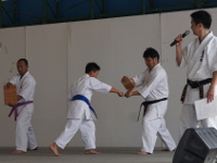 演武には玉川・須賀川・平田道場から総勢20名が参加しました。 このお祭りは毎年盛況で、観客が沢山いる中子供達もとても緊張しながらの演武でしたが、殆どの生徒は板割りや型・ミット打ちを成功させ、最後は阿部泰聖君が手刀で瓦割りを、増子分支部長が征遠鎮の型を打った後、猿臂(ひじ)による瓦10枚割りを成功させ締めくくりました。 今回の演武では、高学年の子が小さい子達の面倒をしっかり見ていて、大きい道場生の成長が感じられました。 ●会津大会にて玉川拳士2名が入賞! 令和元年9月29日(日)に河東総合体育館において、第18回福島県会津空手道選手権大会が開催されました。 玉川道場から出場した小針嘉人君と二瓶太一君は、共に組手小学6年男子上級の部において太一君準優勝、嘉人君第3位と大健闘しました。 ●秋季全日本大会出場者に激励金! |